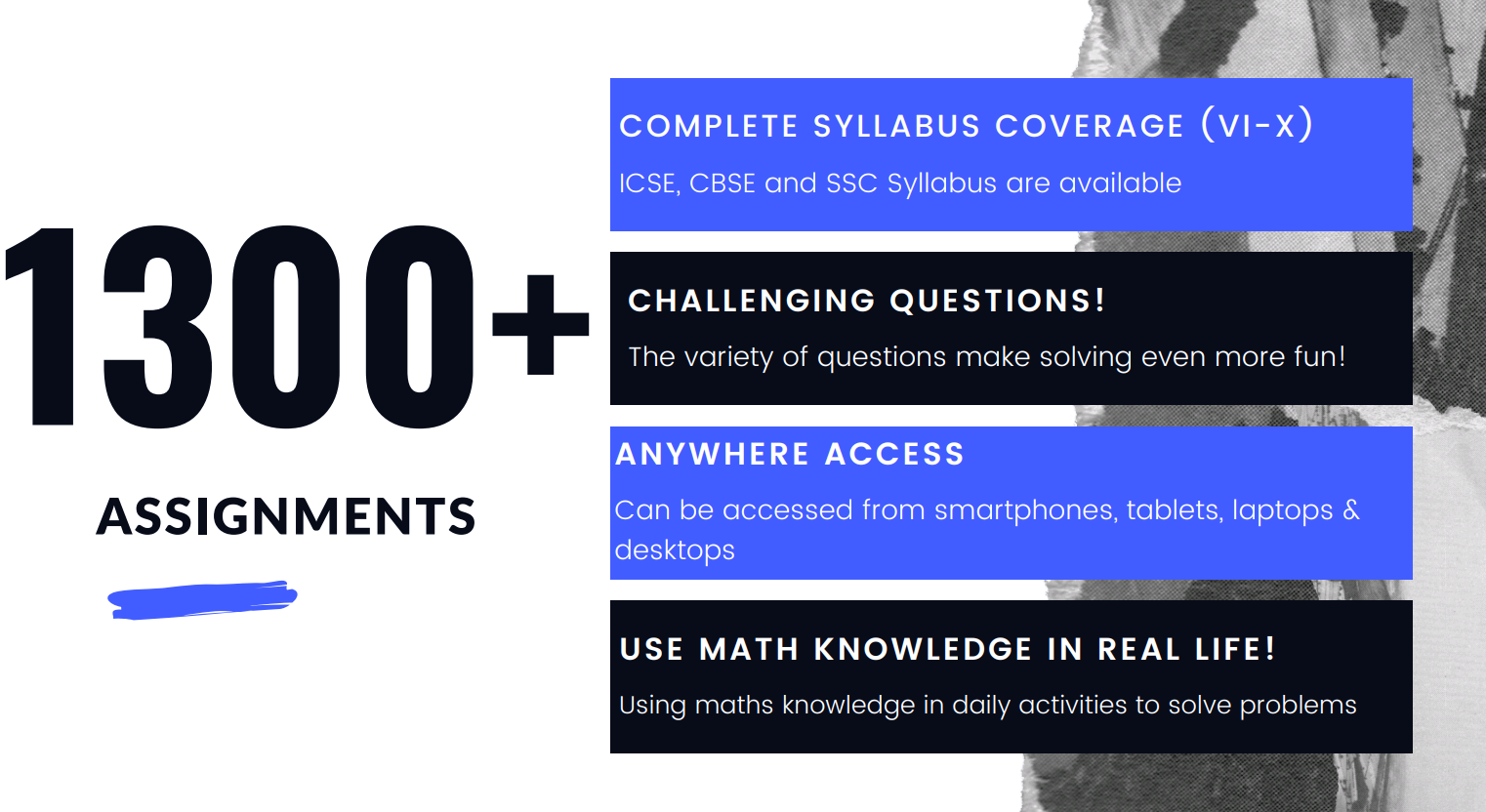 • Increasing the assignments count to more than 1200 by adding new assignments to classes VI & VII of CBSE, ICSE, Telangana and A.P. State board syllabus